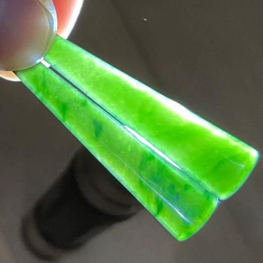 • Pair of toki earrings hand-carved from New Zealand Kawakawa Jade/ pounamu (greenstone), with silver fittings. Front.