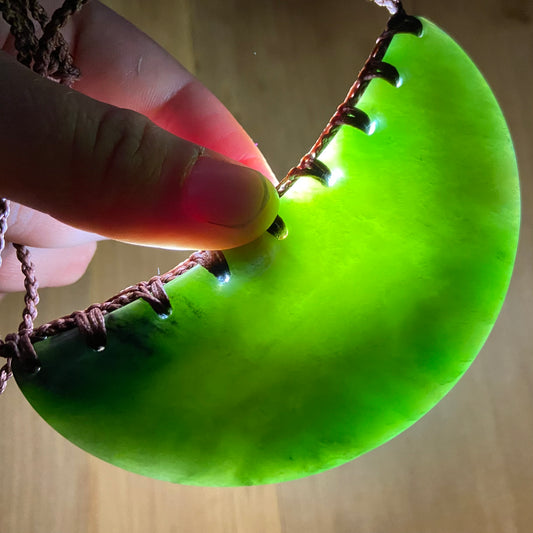 • Toki pendant hand-carved from New Zealand Marsden Flower Jade/ pounamu (greenstone). Front.