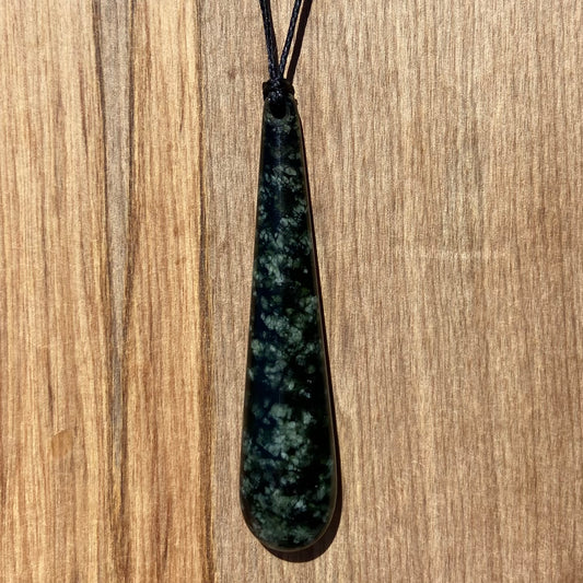 • Roimata (teardrop) pendant hand-carved from New Zealand tangiwai pounamu (greenstone). Front.