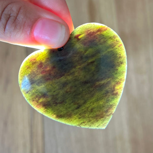 • Heart pendant hand-carved from New Zealand totoweka pounamu (greenstone). Front.
