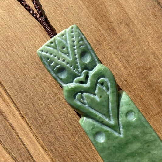 • Tekoteko toki pendant hand-carved from New Zealand Marsden Flower Jade/ pounamu (greenstone). Front.