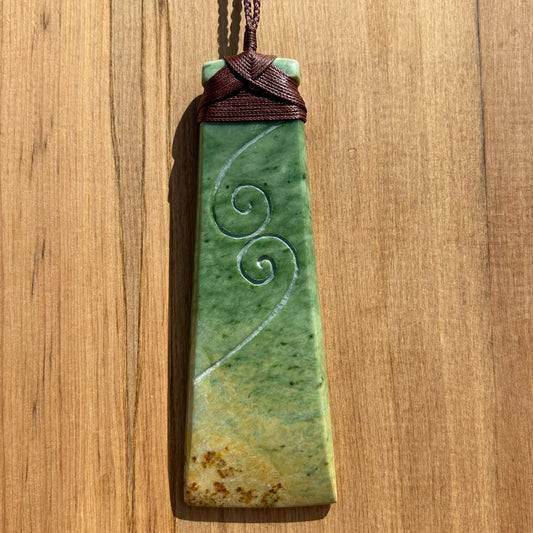 • Koru toki pendant hand-carved from New Zealand Marsden Flower Jade/ pounamu (greenstone). Front.