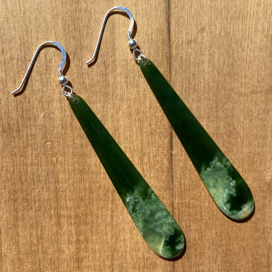 • Pair of roimata (teardrop) earrings hand-carved from New Zealand Marsden Flower Jade/ pounamu (greenstone), with sterling silver fittings. Front.