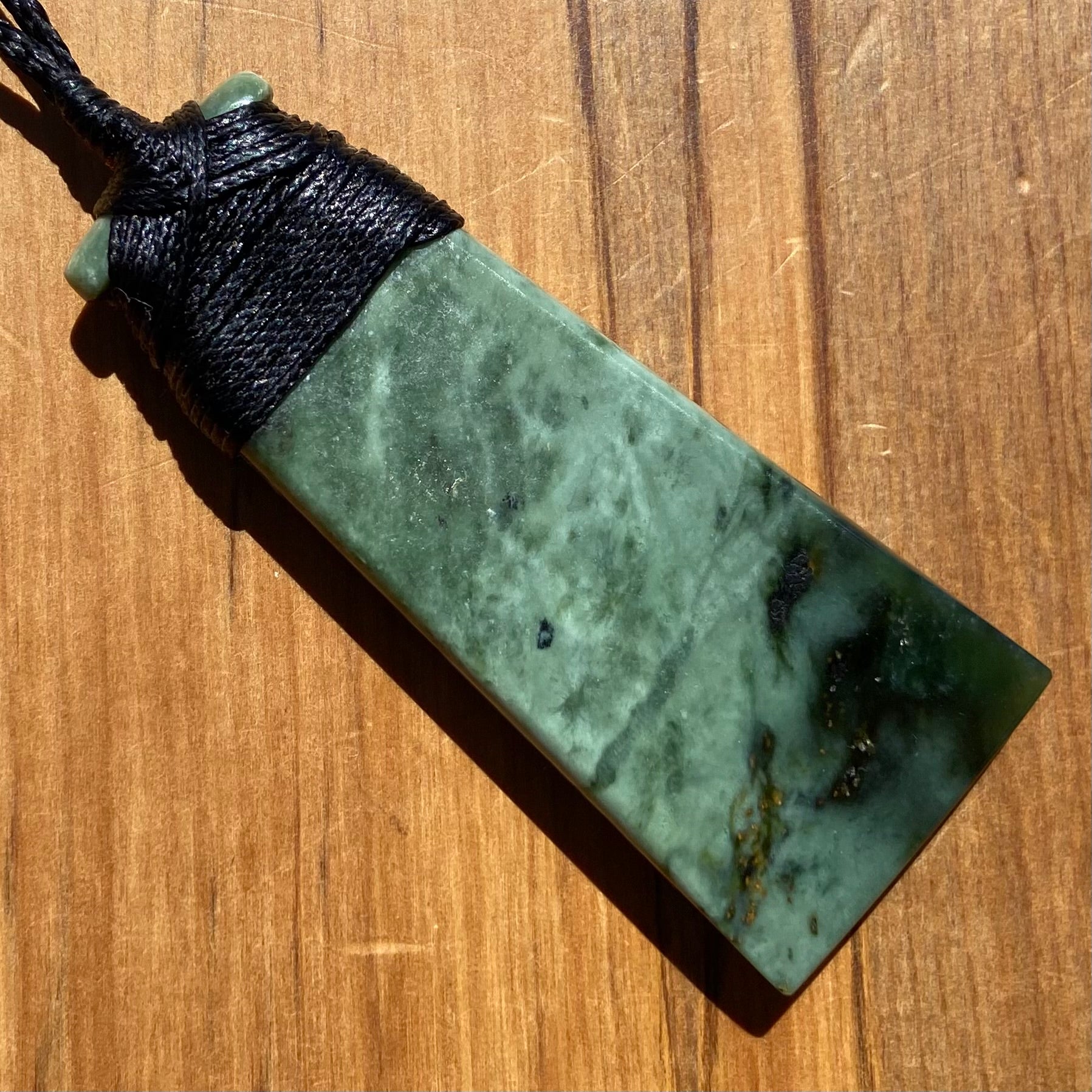 This bound toki pendant is carved from NZ Kawakawa Pounamu with beautiful pale flower.
